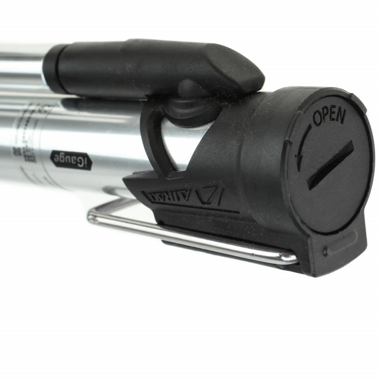 Diese Pumpe wird nicht nur auf das Ventil gesteckt, sondern – wie bei grossen Standpumpen – mit einem Klemm-Hebel zusätzlich fixiert. Das ermöglicht einfacheres Pumpen und es geht keine Luft am Ventil vorbei.