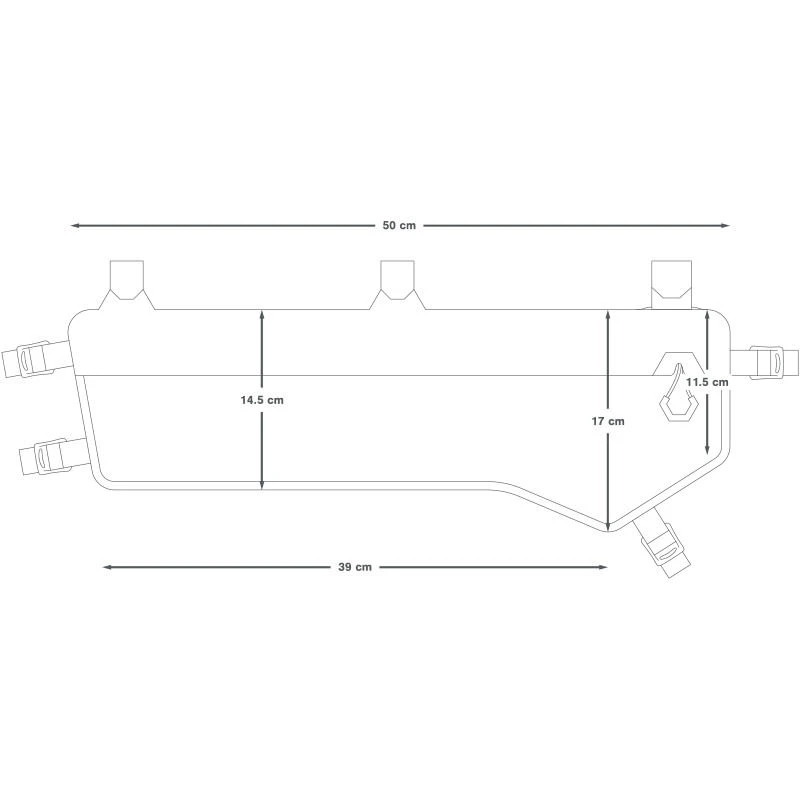 Die Tasche ist auf breitere Rahmendreiecke zugeschnitten und aus leichtem wetterfestem Laminat geschneidert, das auch widerstandsfĂ€hig genug fĂŒr den Off-Road-Gebrauch ist. Die Tasche ist stabil genug, um auch schwerere Dinge aufzunehmen und damit den Schwerpunkt des Rades niedrig zu halten.