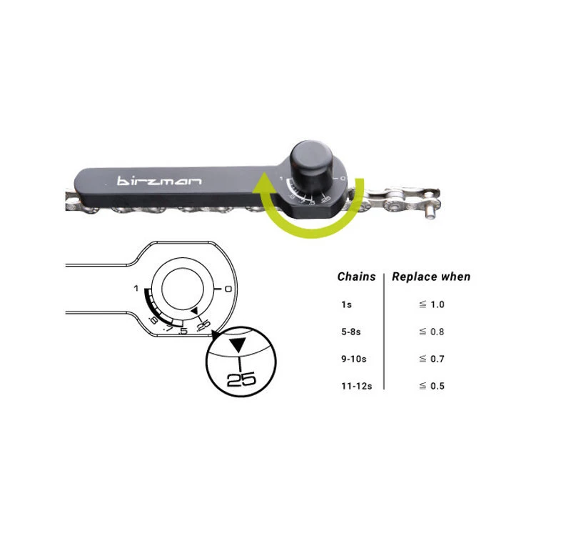 Anders als die meisten Kettenlehren handelt es sich hier nicht um eine Grenzlehre, die einen Wertangibt. Hier lässt sich stufenlos ablesen, wie die Kette langsam verschleisst, weil verschiedene Längungen von 0,25% bis 1% abmessbar sind. Gerade die aktuellen 12fach-Ketten sind sensibler im Verschleiss. Und Birzman hat eine wirklich guten Kettenpüfer konstruiert.