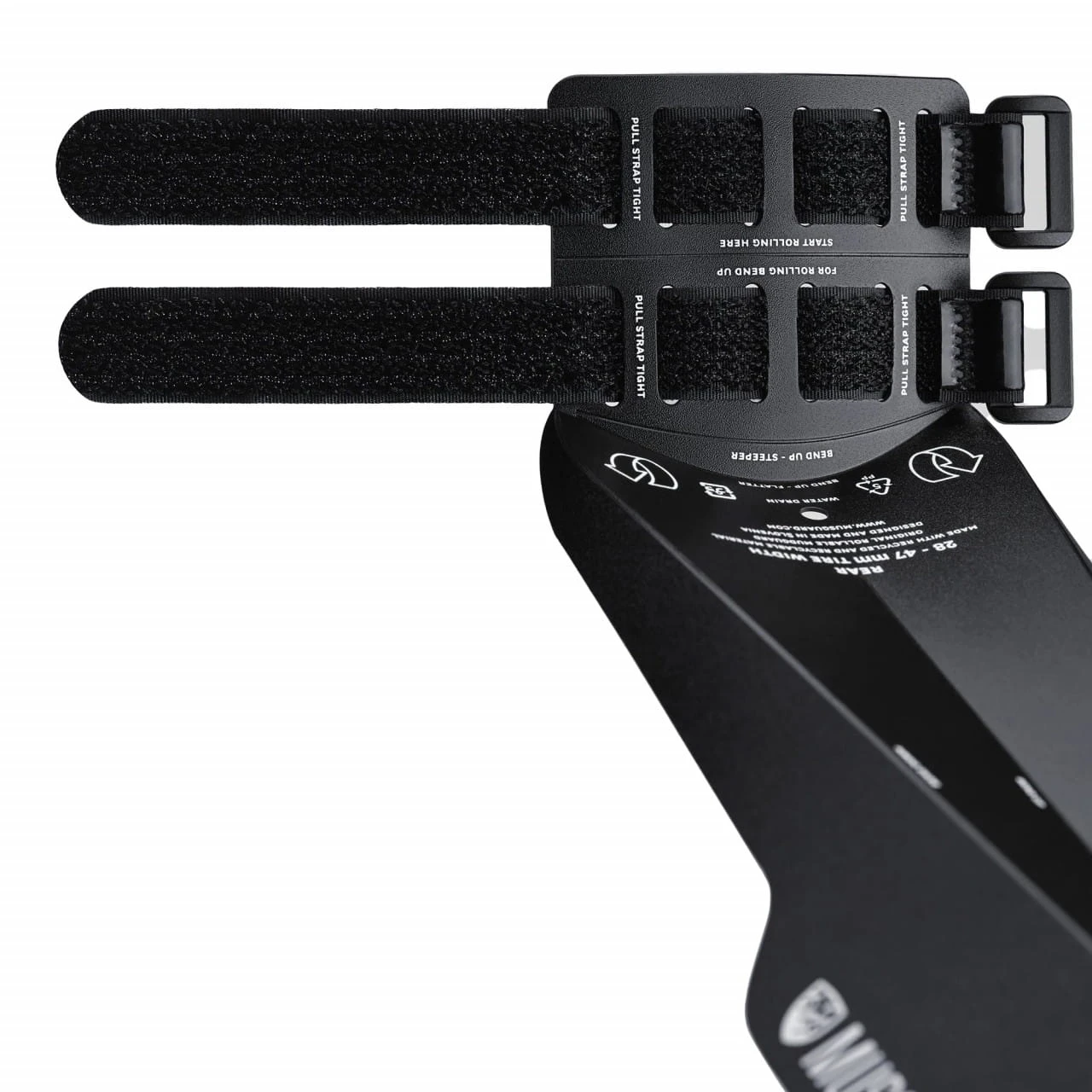 Zum Festmachen musst du einfach die Enden mit den Klettlaschen hochbiegen und diese dann fest um SattelstĂŒtze bzw. Unterrohr rollen. Sie sind fĂŒr Bikes mit verschiedenen Rohrdurchmessern geeignet. Das hintere Schutzblech lĂ€sst sich auĂerdem in verschiedenen Winkeln einstellen – je nachdem, was fĂŒr dein Bike am besten funktioniert.