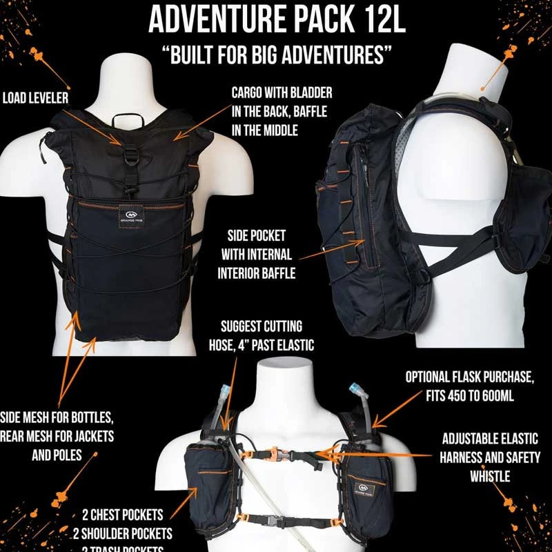 Der Orange Mud Adventure Pack 12 Liter Rucksack ist perfekt fĂŒr lange und kĂŒrzere Distanzen geeignet. Er ist so leicht und klein, dass er bei kĂŒrzeren Ultra-LĂ€ufen, Mountainbiketouren, etc. funktioniert aber auch so elastisch und damit vergröĂerbar, dass man mit ihm eine Tagestour unternehmen kann.