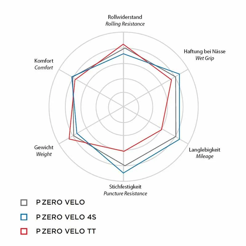 Zur Feinabstimmung der Reifenprofile von P Zero und P Zero Velo 4S (das TT Modell ist ein reiner Slick) nutzte Pirelli das vom Motorsport inspirierte Groove Design. Das Profilmuster, welches nicht nur eine ästhetische Funktion hat, ist angelehnt an das vom Diablo Supercorsa, einem der besten SSP Reifen (SuperSport-Klasse der World SuperBike Rennserie) von Pirelli. Winkel, Querschnitte und Abstände des Profilmusters wurden genau untersucht, um seine Performance bei Wasserableitung, Trocken- und Nasshaftung, Laufleistung, Reaktionsverhalten sowie Fahrkomfort und Handling zu optimieren. Das Reifenprofil erinnert an Blitze und bildet in der Mitte der Lauffläche sehr spitze Winkel mit ausgeprägten lateralen Öffnungen an den Seiten für optimierte Wasserableitung und glattes Abrollverhalten sowie gleichmäßige Abnutzung. Zusätzlich verfügt das Reifenprofil über progressive Tiefe für verbesserte Haltbarkeit und optimale Kontrolle selbst in extremer Kurvenlage. Die Lauffläche der P Zero™ Velo ist aus drei verschiedenen Abschnitten aufgebaut: die Mitte besteht aus einer glatten Oberfläche für optimalen Geradeauslauf, auf beiden Seiten schließen stärker profilierte Bereiche an für optimales Kurvenverhalten, die in Semi-Slick Ränder übergehen für unmittelbare Rückmeldung im Grenzbereich bei Kurvenfahrt. Das Ergebnis ist optimaler Reifenkontakt unter allen Fahrzuständen.