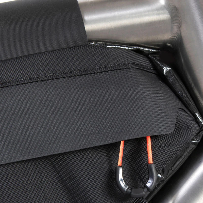 Die Frame Bag des britischen Herstellers Restrap mit vier Klettverschluss-Riemen zwischen Oberrohr und Unterrohr befestigt und ermöglicht den direkten Zugriff auf Smartphone, Werkzeug, Verpflegung oder Zubehör. Die robusten und wasserfesten Materialien sowie der abgedichtete Reißverschluß sorgen dafür, dass der Tascheninhalt immer trocken bleibt schließlich wurde die Frame Bag von Restrap im regnerischen Yorkshire entwickelt und ausgiebig getestet. An der Vorderseite der Tasche ist eine kleine Öffnung, welche für ein Kabel vorgesehen ist, damit du die Option hast, Geräte zum Beispiel über eine Powerbank zu laden.